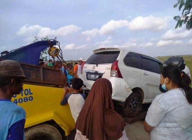 Akibat salah injak rem, pengemudi roda empat jenis Avanza Velos bernopol T 1586 KN bablas keluar jalur, hingga kerperosok ke area pesawahan di Babawangan Desa Lemahmukti, Kecamatan Lemahabang.