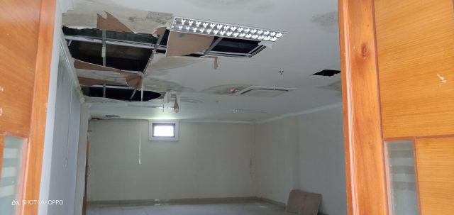 Plafon atapnya jebol, rusak dan nyaris ambruk. Beberapa atap bolong-bolong dan aliran-aliran listrik mati karena terguyur air hujan. Air pun merembas melalui tembok-tembok sampai ke lantai II.