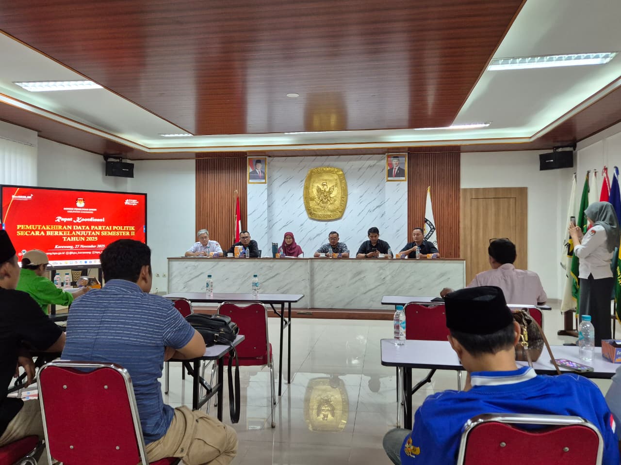 KARAWANG– Badan Pengawas Pemilu (Bawaslu) Kabupaten Karawang menghadiri Rapat Koordinasi (Rakor) Pemutakhiran Data Partai Politik Semester II yang diselenggarakan oleh Komisi Pemilihan Umum Daerah (KPUD) Karawang, Kamis (27/11/2025)
