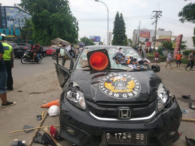 Akibat bentrokan tersebut, dua anggota ormas terluka parah dikepung massa ormas yang lain. Satu mobil Honda Brio berplat nomor S 1724 BB alami rusak berat.