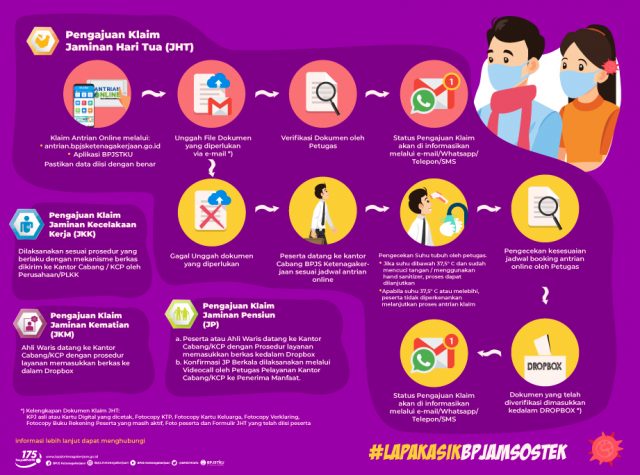 Dokumen di dalam dropbox akan diteruskan secara berkala kepada petugas back office untuk diproses lebih lanjut. Diharapkan dengan cara seperti ini, akan meminimalisir risiko penyebaran Covid-19 semakin meluas. Informasi lebih lanjut terkait pelayanan BPJAMSOSTEK atau terkait Protokol Lapak Asik, peserta dapat menghubungi Layanan Masyarakat 175, atau melalui situs resmi www.bpjsketenagakerjaan.go.id dan akun resmi BPJAMSOSTEK di Facebook BPJS Ketenagakerjaan atau Twitter @bpjstkinfo.