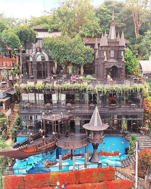 Salah satu daya tarik paling mencolok dari tempat ini adalah desainnya yang menyerupai kastil berwarna gelap.