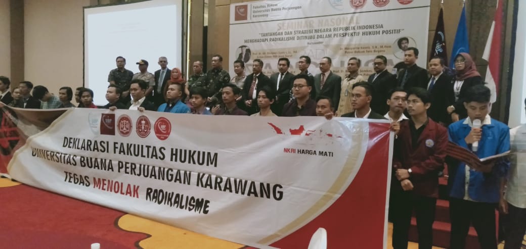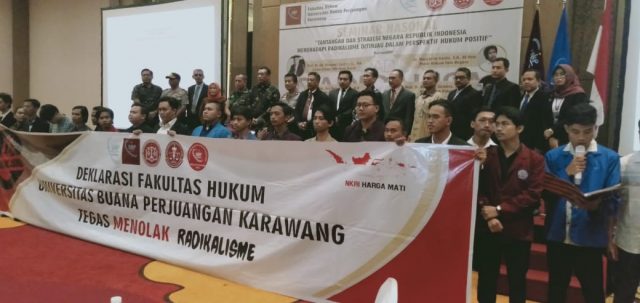 Dijelaskannya, dalam deklarasi anti radikalisme tersebut Fakultas Hukum UBP Karawang menyatakan berpegang teguh pada posisi masyarakat berbangsa dan bernegara kesatuan NKRI, yaitu Pancasila sebagai Ideologi dan pandangan hidup bangsa Indonesia,UUD 1945 serta semangat Bhineka Tunggal Ika, bertekad mempersiapkan serta membentuk generasi akademik yang memiliki jiwa nasionalisme yang kuat, demokrasi, jujur berkeadilan dengan menjungjung tinggi nilai-nilai etika, HAM, kemajemukan kerukunan persatuan dan kesatuan bangsa yang berwawasan Nusantara. Menolak organisasi dan aktivitas berorientasi dan berafiliasi dengan gerakan radikal terorisme yang betentangan UUD 45 dan peraturan UU.
