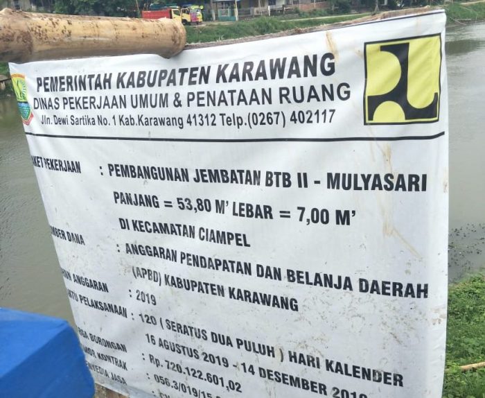 Pasalnya, pembangunan jembatan yang panjangnya 53,80 Meter dengan lebar 7,00 Meter dan menghabiskan anggaran APBD 2019, sebesar Rp721 juta tersebut, dari plang proyeknya diketahui di bangun di BTB II Desa Mulya Sari, namun di lapangan, jembatan tersebut faktanya malah dibangun di Desa Mulya Sejati.