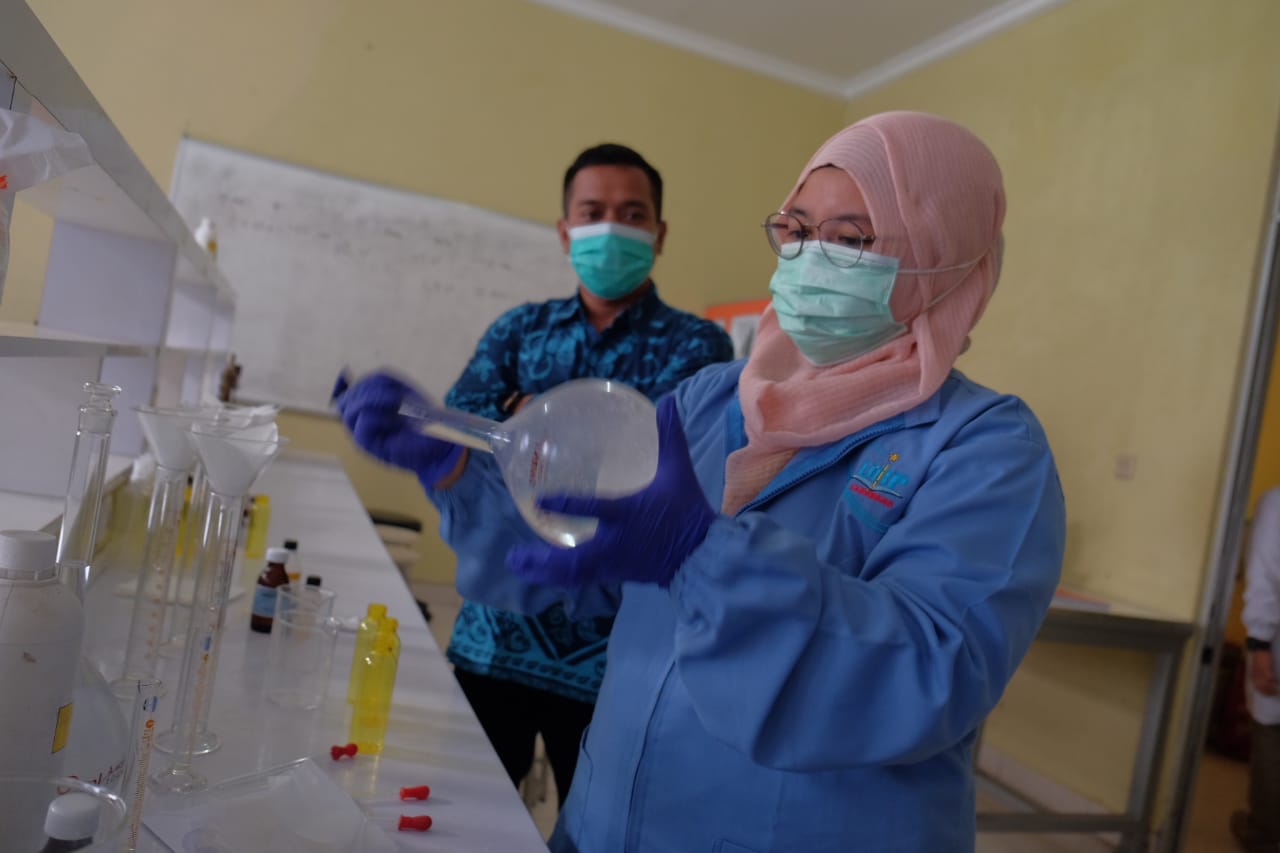 “Kita produksi sesuai standar yang ditetapkan WHO saat pademi corona ini. Kadar alkoholnya mencapai 95 persen. Standar paling tinggi. Ditambah bahan lainnya seperti diserine, H2O2, Essence, Aquadesh,” kata Neni saat membimbing mahasiswa di Lab.