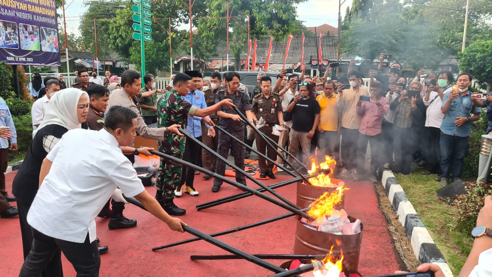 KARAWANG- Kejaksaan Negeri (Kejari) Karawang musnahkan ribuan barang bukti tindak kriminalitas dari bulan Desember 2022 sampai Maret 2023.