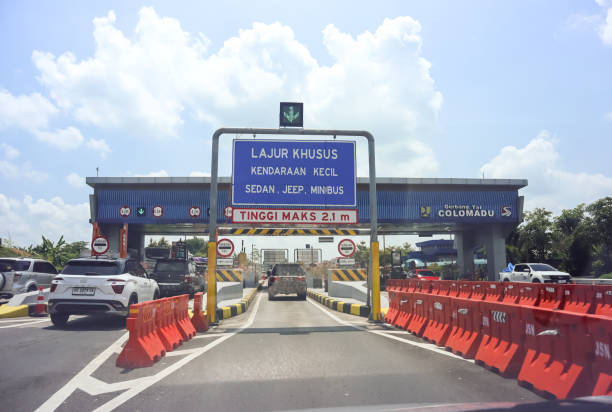 Klaten Indonesia, April 14, 2024. Colomadu toll entrance gate with cars in queue. Translate indonesian text : Special track for city car only (sedan, jeep, minibus), maximum vehicle high 2.1 meters
