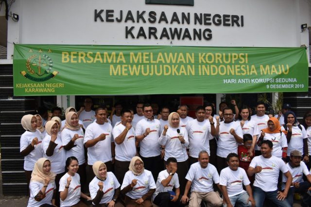 Dalam peringatan hari anti korupsi, Kejaksaan Negeri Karawang membagikan stiker dan bunga ke instansi di sekitar kantor Kejaksaan. (fzy/dhi)