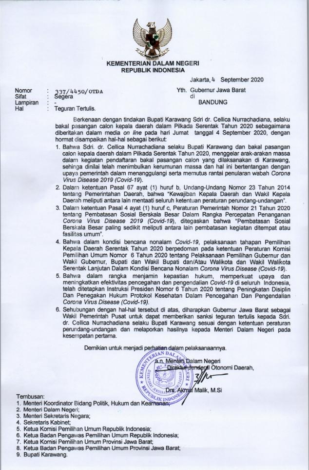 Mendagri dalam rilisnya terkait teguran tertulis itu, di Jakarta, Sabtu (05/09) pagi menyatakan Bupati Karawang selaku bakal pasangan calon telah menimbulkan kerumunan massa dengan arak-arakan massa.