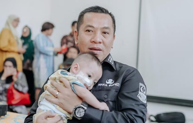 Wabup Aep Syaepuloh saat mengendong Adinda Adzra balita pengidap kelainan jantung (Foto: Ist)