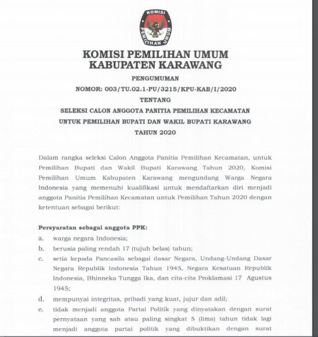 Disampaikan Ketua KPUD Kabupaten Karawang, Miftah Farid kepada BERITA PASUNDAN, beberapa waktu lalu, Proses rekrutmen akan dilakukan mulai tanggal 15 Januari kemarin, sampai 14 Februari 2020.