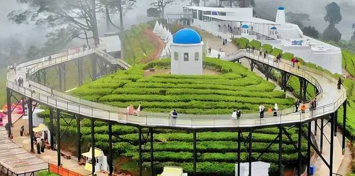Di Nimo Highland kamu bisa berjalan-jalan menikmati pemandangan kebun teh dan pegunungan, sambil foto di sini di atas jembatan kaca yang aesthetic.