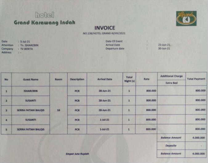 Yaitu di mana 3 orang pasien covid-19 (sekeluarga) harus membayar Rp 4 juta rupiah, setelah mereka menjalani isolasi (perawatan) di Hotel Karawang Indah selama dua minggu. Ironisnya, invoice tagihan biaya perawatan 3 pasien covid-19 ini dikeluarkan oleh pihak hotel (bukan oleh pihak klinik).