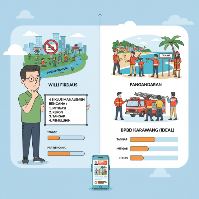 Menurut Willi, lembaga penanggulangan bencana seharusnya menjalankan empat siklus manajemen bencana, yaitu mitigasi, rencana kontingensi (rekon), tanggap bencana, dan pemulihan. Namun dalam praktiknya, sebagian besar BPBD kabupaten/kota di Jawa Barat, termasuk BPBD Karawang, masih berfokus pada tahapan tanggap bencana dan pra-bencana saja.