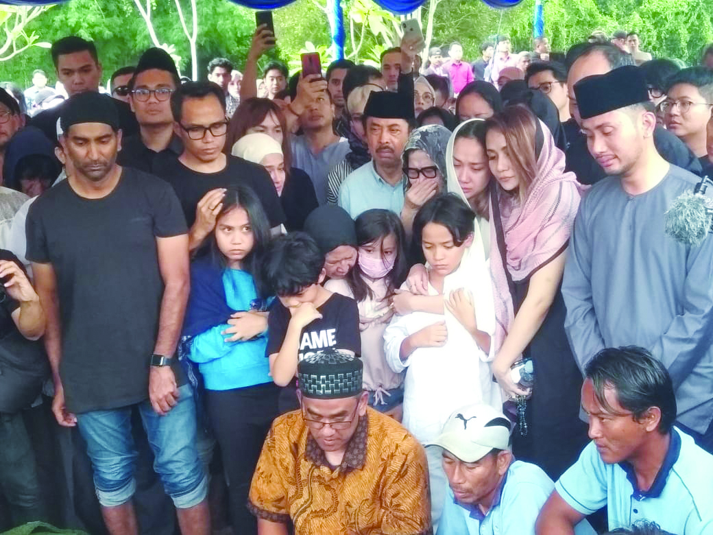 Setelah jenazah dikuburkan, BCL bersama anaknya Noah menaburkan bunga dan mengguyur air mawar di mulai dari kepala atas hingga ke bagian kaki makam.