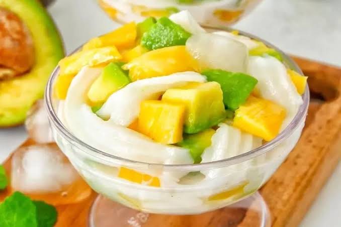 - Susun alpukat, kelapa muda dan nangka dalam gelas saji.