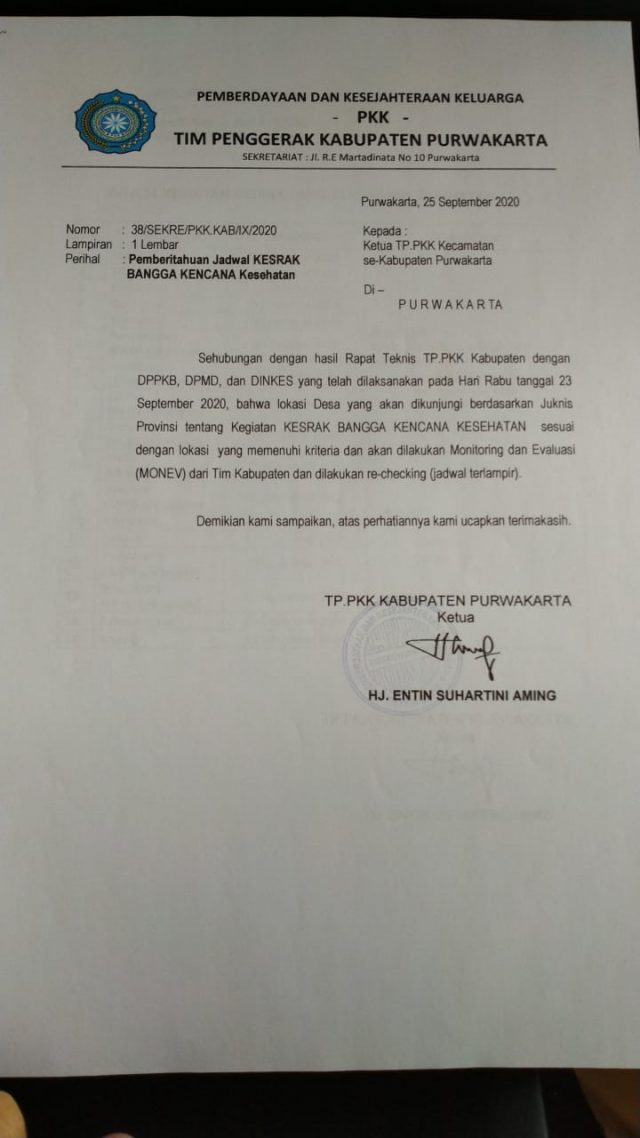 “Kami sudah menerima mandat dari Ketua PKK Kabupaten,” jelas Wakil Ketua Penggerak PKK Kabupaten Purwakarta Hj.Jamilah sembari memberikan surat pemberitahuan kegiatan PKK sejak tahun 2020 yang lalu Rabu (27/1).