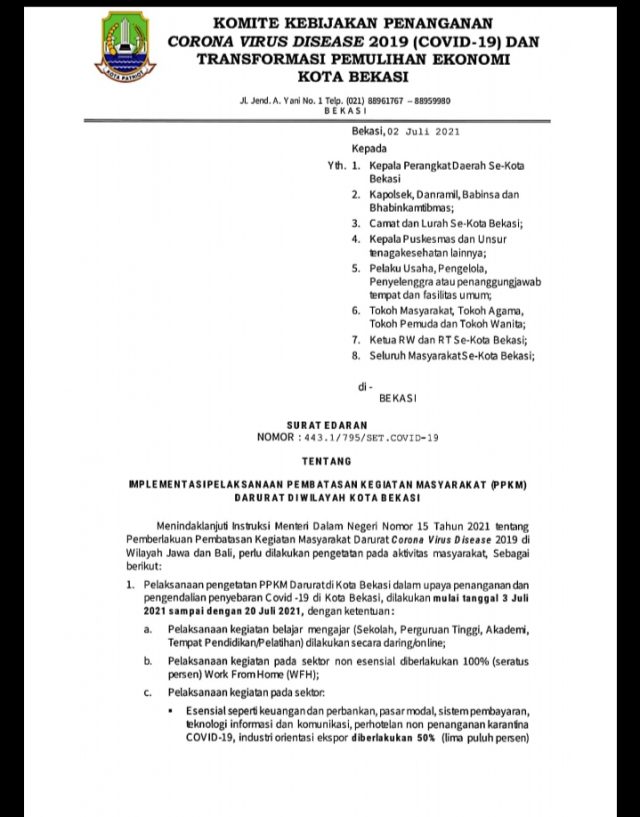 Darurat melalui Surat Edaran Komite Kebijakan Penanganan Covid-19 dan Transformasi Pemulihan Ekonomi Kota Bekasi Nomor : 443.1/795/SET.COVID-19 Tentang Implementasi Pelaksanaan Pembatasan Kegiatan Masyarakat (PPKM) Darurat di Wilayah Kota Bekasi.