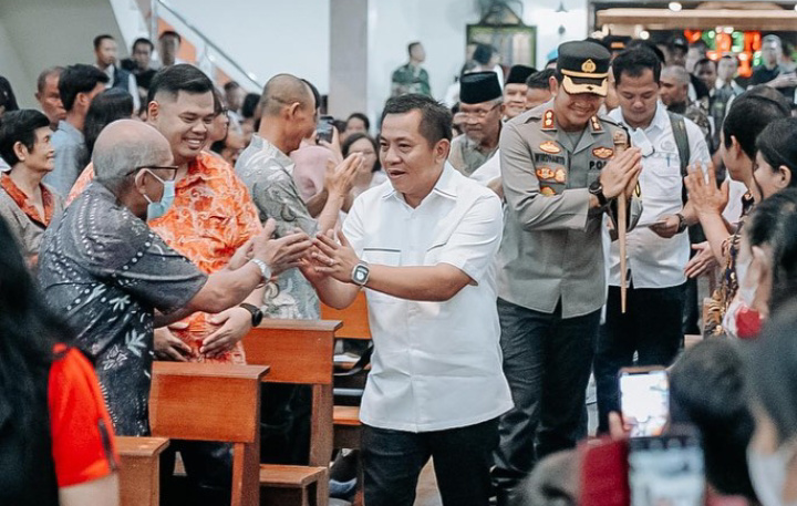 KARAWANG – Bupati Karawang, Aep Syaepuloh bersama unsur Forkopimda meninjau sejumlah gereja yang tengah merayakan malam Natal 2023. Aep memastikan bahwa perayaan Natal di Karawang berjalan aman dan damai.