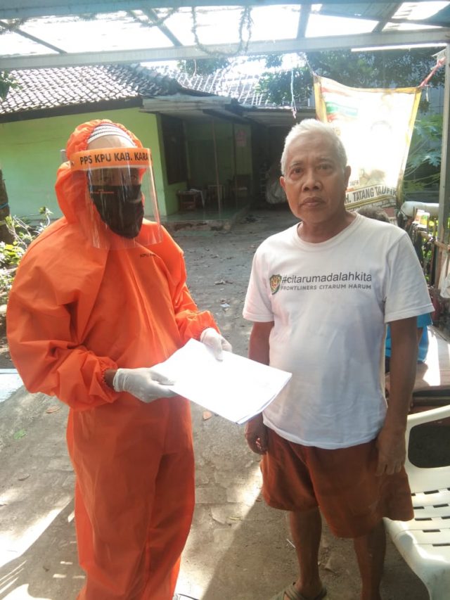 Petugas panitia pemungutan suara (PPS) yang melakukan verifikasi faktual datang dengan protokoler covid 19, menggunakan alat pelindung diri (APD) lengkap. Petugas yang tersebar di 309 desa kelurahan tersebut akan memverifikasi 108.578 dukungan ke pasangan perseorangan Endang dan Asep Agustian.