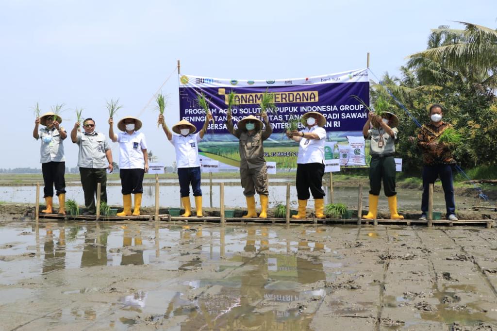 Karawang — Puluhan petani binaan PT Pupuk Kujang bersama Wakil Menteri Pertanian RI Harvick Hasnul Qolbi dan jajaran direksi Pupuk Indonesia juga Pupuk Kujang melakukan penanaman perdana di pesawahan Desa Pancakarya, Kecamatan Tempuran, Kabupaten Karawang, Kamis, 25 Maret 2021.
