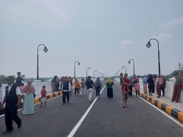 Pasca diresmikan, terpantau masyarakat setempat ramai-ramai berjalan kaki, lalu lalang sambil melihat air bendungan dari atas jembatan baru.